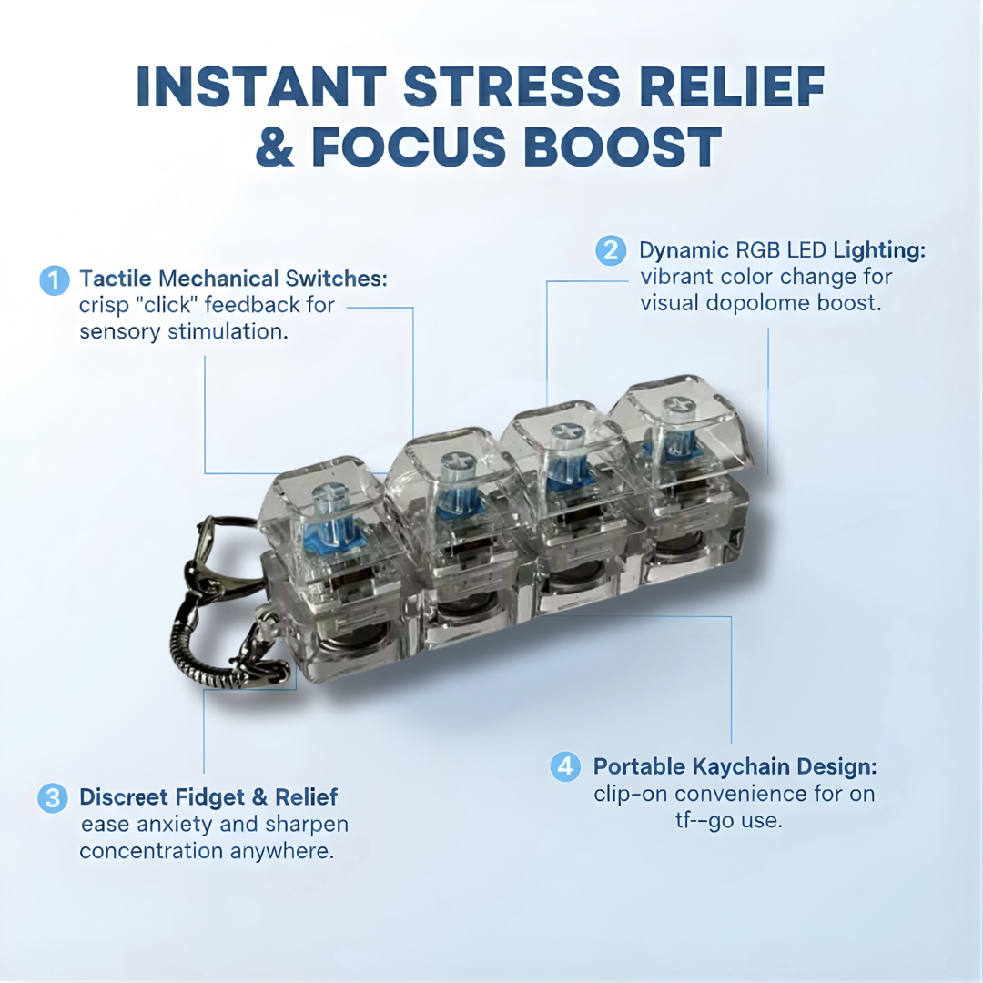 Built with premium mechanical switches for satisfying clicks, vibrant RGB lighting that shifts with every press, and a compact, durable design that clips easily to your keys or bag.